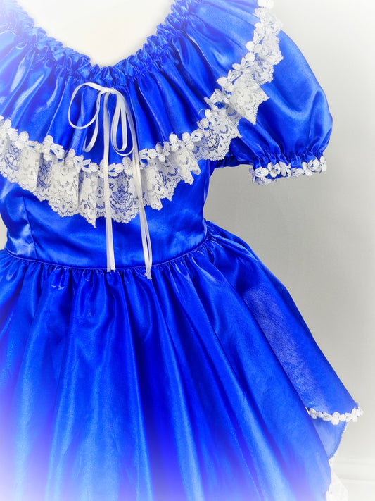 5-6 years. Royal blue vintage gown with white lace details and Ruffles at the back