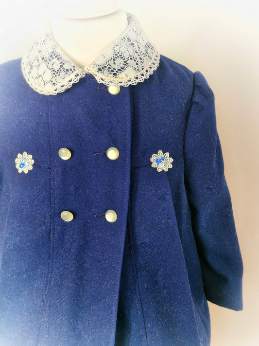 2 years. Navy double breasted coat and bonnet set with with lace details, flowers and button by Cute Togs. Small dot on collar*