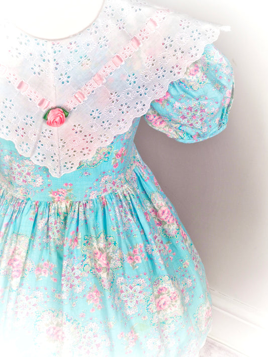 4 years. Bright blue vintage dress, Miss Victoria, with pink floral patters, white eyelet bib with pink rosette and satin ribbon