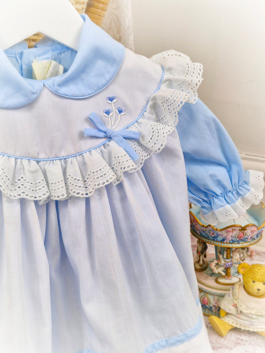 12-18 months. Two piece, blue dress with puff sleeves and Peter Pan collar with white apron, trimmed with white lace and blue embroidered flowers