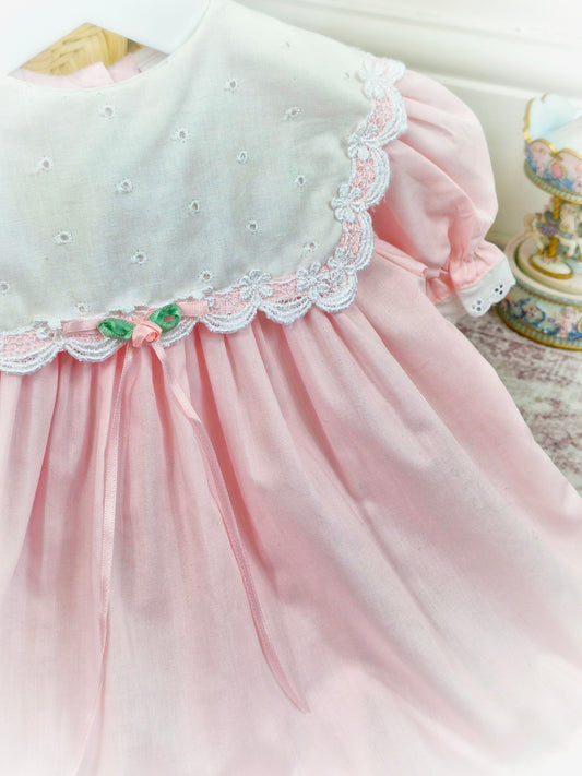 9-12 months. Pink vintage Bryan with white eyelet bib, pink ribbon and puff sleeves