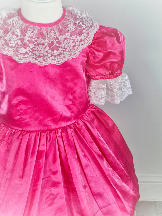 5 years. Hot pink vintage dress with bubble hem and white lace neckline