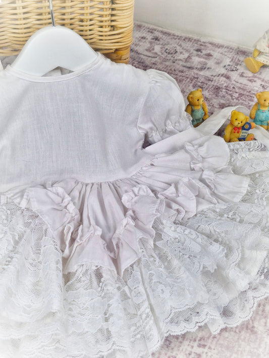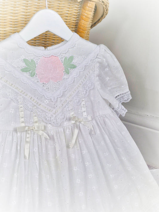 3-4 years. White vintage broderie anglais dress with lace, ribbon and a pink flower applique