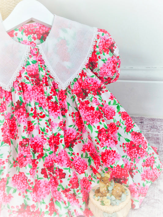 2-3 years. Two piece set from Plum Pudding Ltd. Dress and bloomers, pink and green floral pattern with large white collar