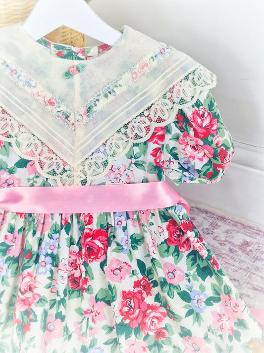 12-18 months. Pink and white vintage floral drop waist dress with frill neck and pink satin ribbon