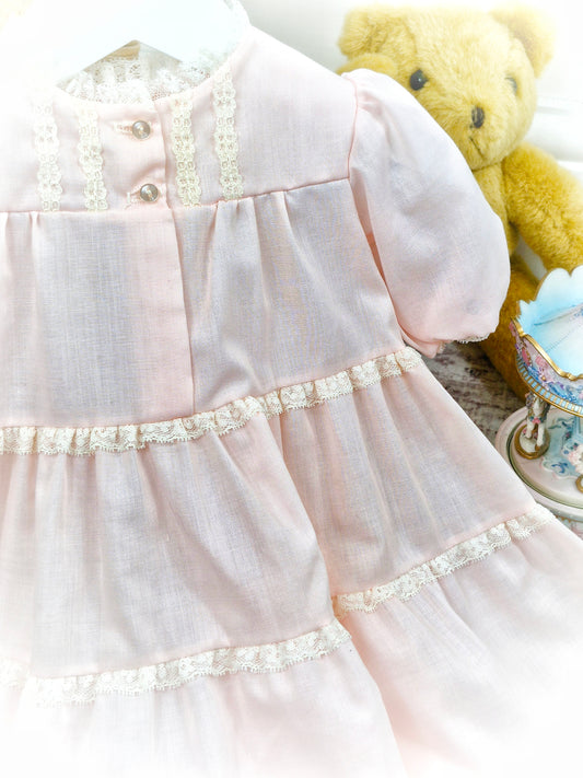 12-18 months. Pastel vintage dress by Evy with white lace collar, bib trim and hem