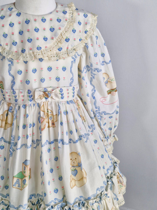 5 years. Vintage cream dress with sweet bears and bunnies and blue hearts and flowers
