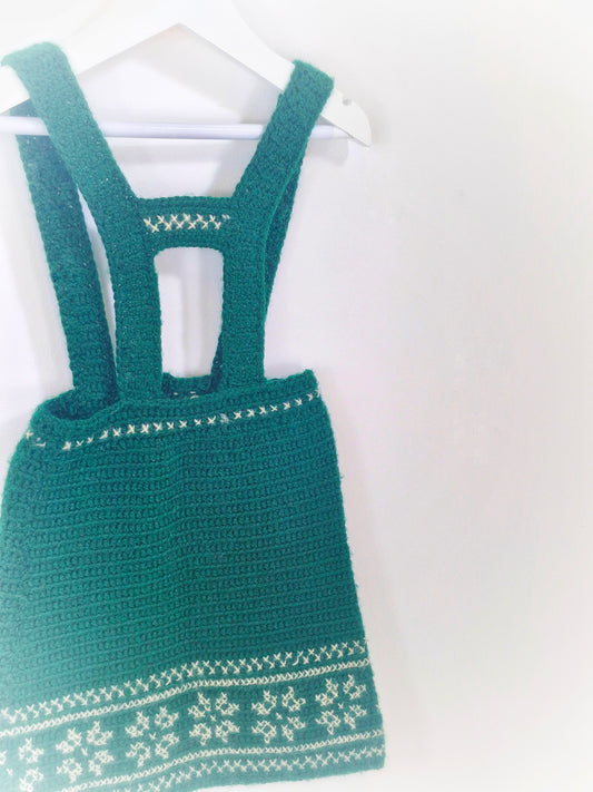 4 years. Dark green knitted pinafore dress with snowflake patterns. Handmade