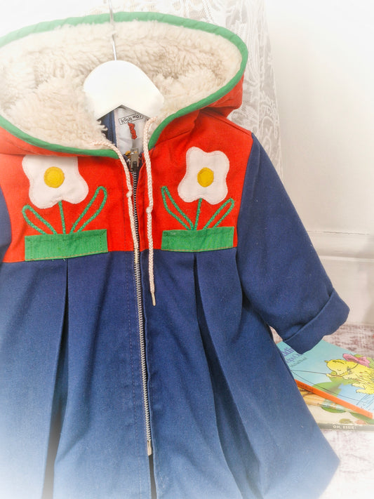 2 years. Colour block vintage coat by Koala Way, fleece hood, pleats and flower appliques