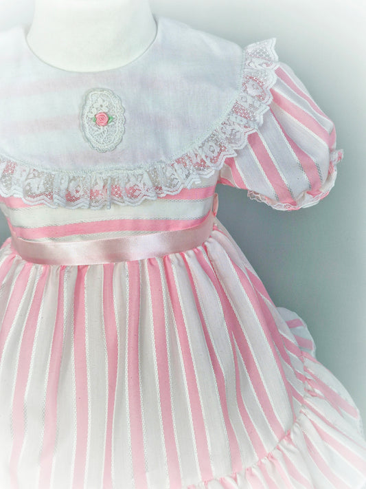 2-3 years. Pink and white candy striped vintage dress by Cookies Corner with white bib and puff sleeves