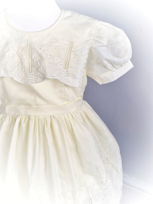 3 years. Cream vintage dress, puff sleeves, scalloped bib and hem with embroidered floral patterns