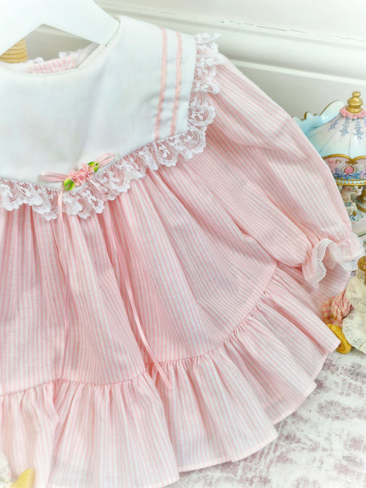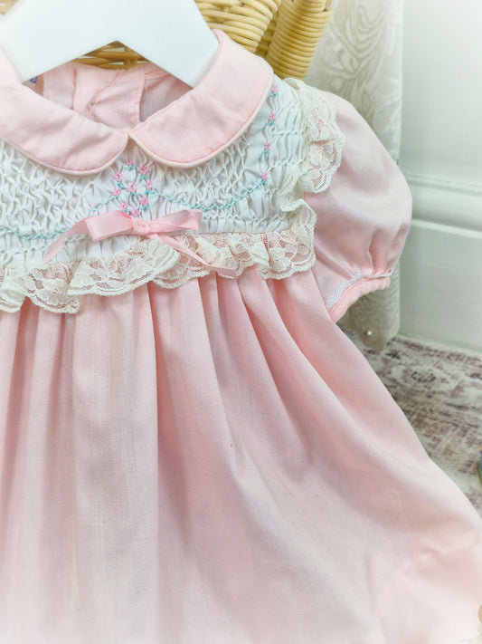 12 months. Pink and white vintage Polly Flinders dress with pink and blue smocking and lace details