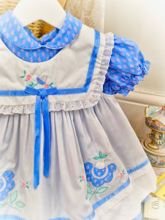 18-24 months/ 2 years. Two piece vintage dress, blue patterned dress with puff sleeves and white apron with blue trim and embroidered flowers