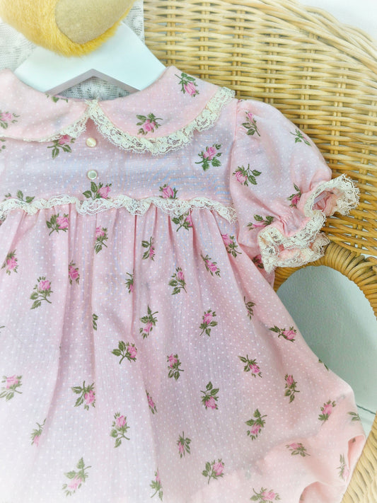 9-12 months. Pink vintage Bryan with white eyelet bib, pink ribbon and puff sleeves