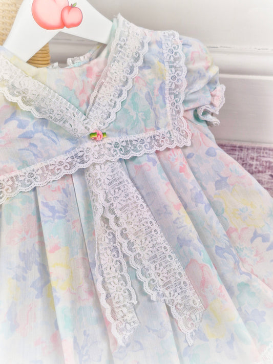 12-18 months. Pastel vintage dress by Evy with white lace collar, bib trim and hem