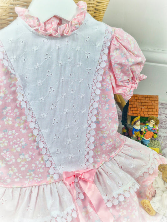 12-18 months. Pink and white vintage floral drop waist dress with frill neck and pink satin ribbon