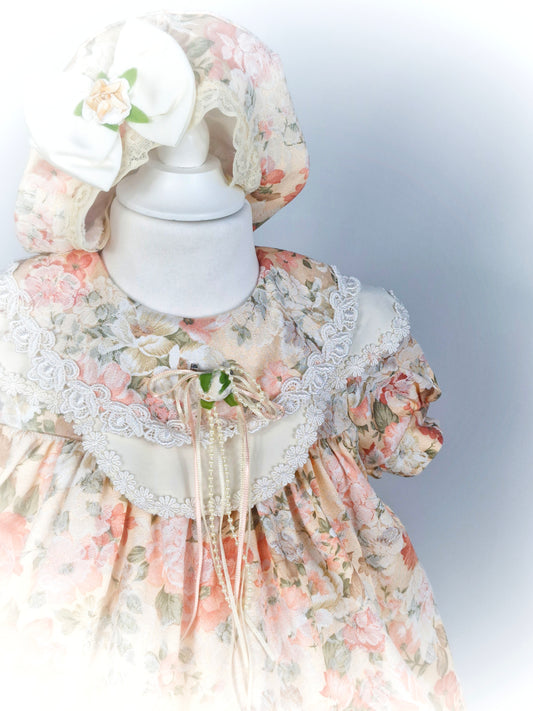 2-3 years. Peach floral vintage dress and matching hat