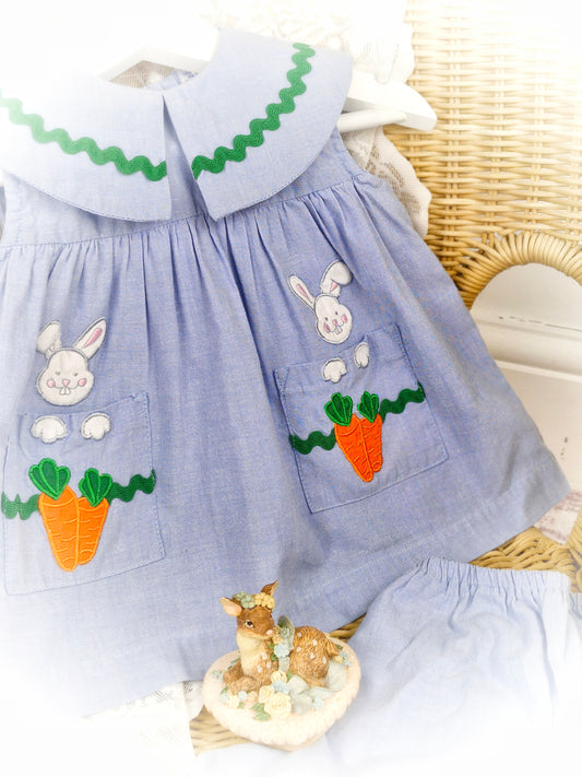 9-12 months. Two-piece vintage Baby Crew set. Blue sleeveless with bunny's and carrots