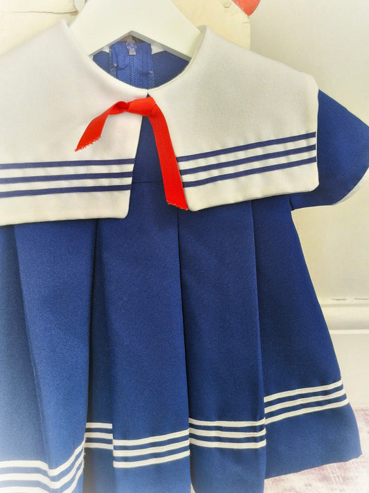 12-18 months. Navy vintage sailor dress with white bib and red ribbon