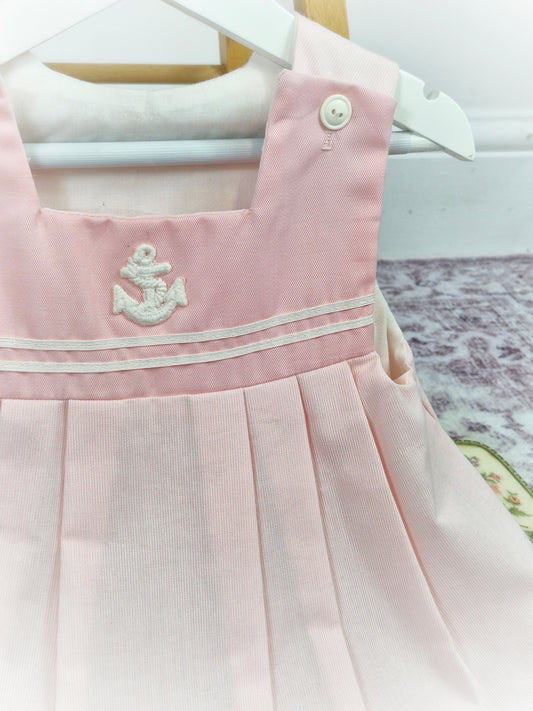 12-18 months. Pink vintage dress with puff sleeves and collar, white apron with scalloped hem and embroidered ship