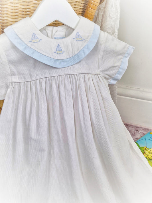 9-12 months. Vintage dress embroidered with boat and matching headband