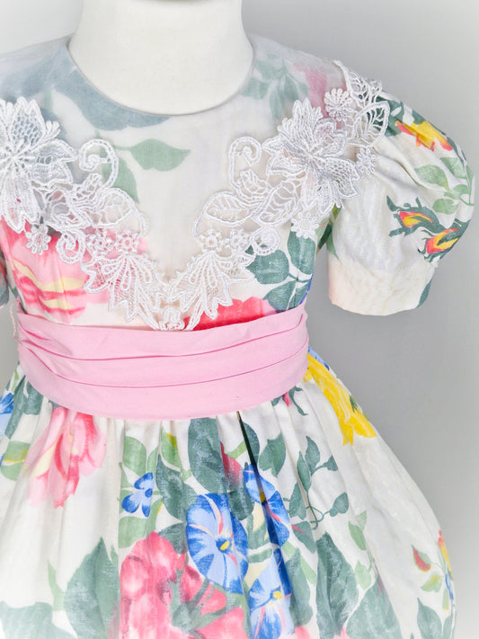 4 years. Vintage Jinelle dress with vibrant floral print, white lace bib collar and pink waist tie and lace hem