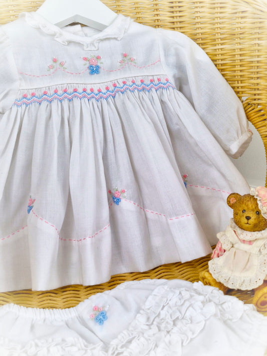 Up to 6 months. White Sarah Louise smock dress and bloomers with delicate embroidered flowers