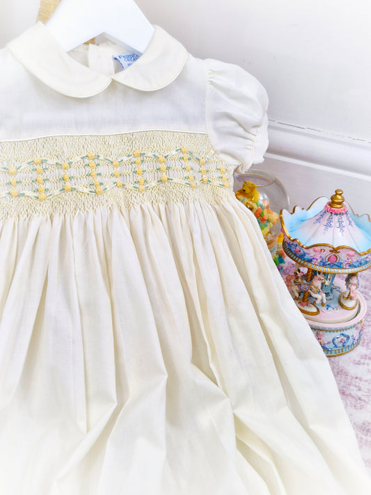 3-6 months. Lemon smocked vintage romper from Friedknit Creations with puff sleeves and Peter Pan collar