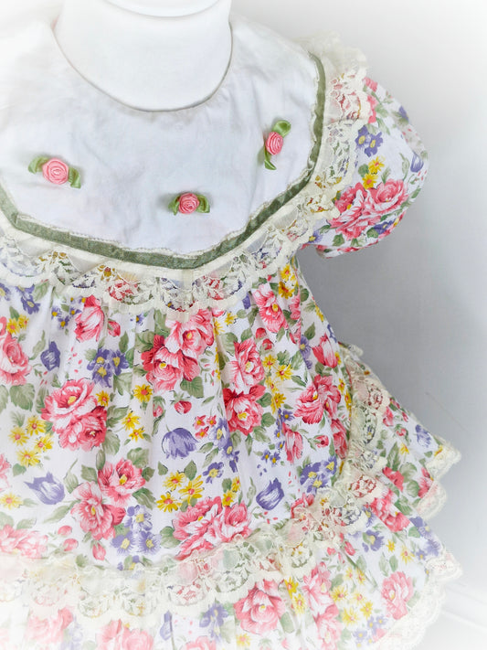 24 months. Floral vintage dress with lace ruffles, large white bib with 3 rosettes and puff sleeves