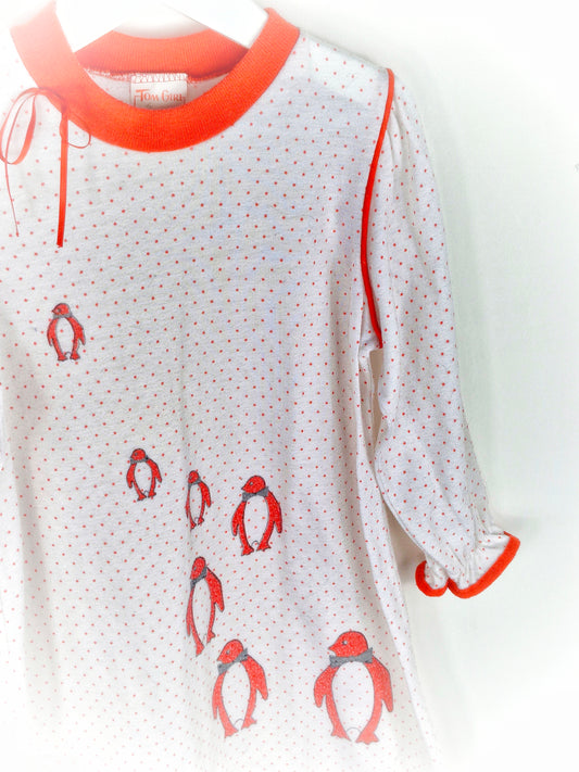 3-4 years. White and red vintage nightie with penguins and polka dots
