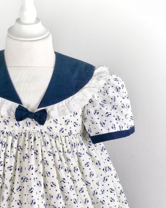3-4 years. White vintage dress with navy sailor hat print, navy collar and bow