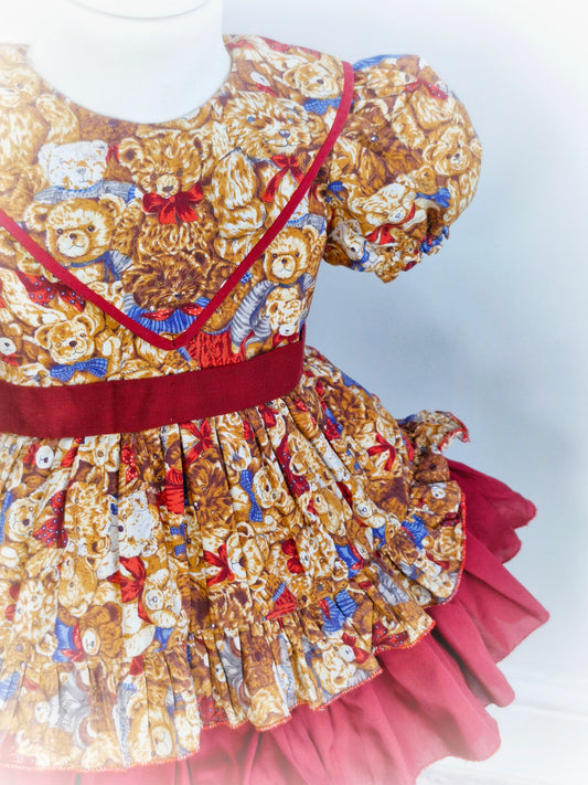 5-6 years. Sleeveless vintage dress with beautiful teddy bear family, alphabet and apples