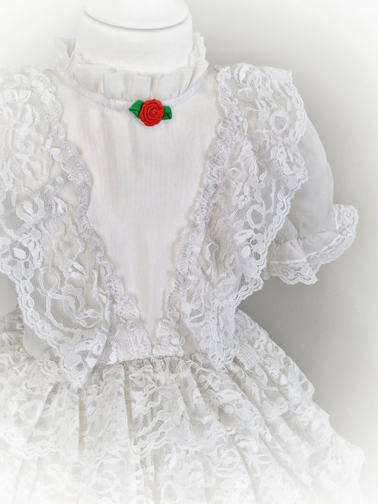 3-4 years. White vintage dress from Le Maj, with lace ruffles and small red rosette centre