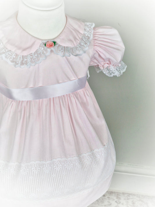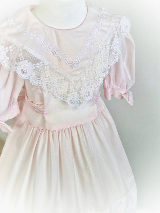 5 years. Light pink vintage Jolene dress with large lace bib and hem