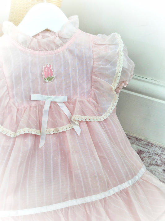 12-18 months. Light pink sheer vintage dress with lace, ruffles and white satin bow