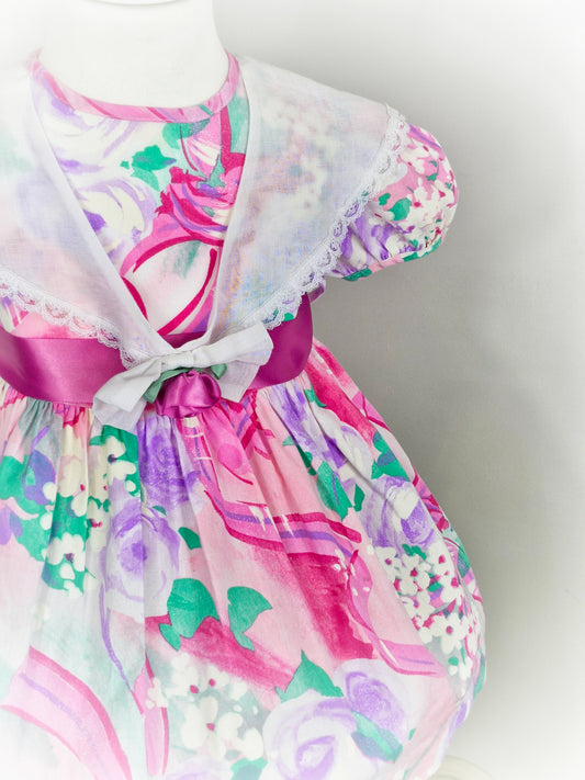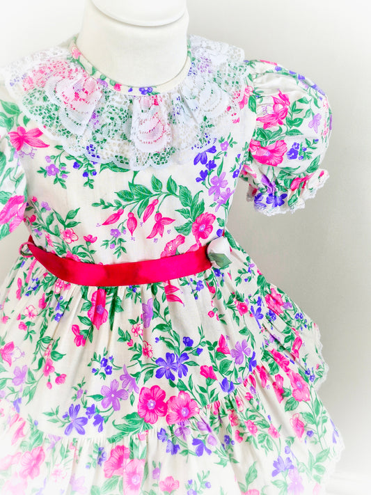 3 years. White vintage dress with vibrant floral print in pink, purple and green. White lace collar and hot pink satin waist tie