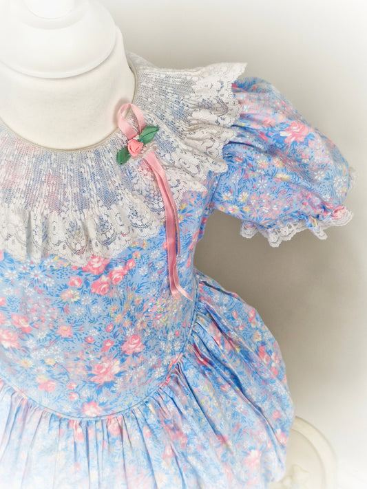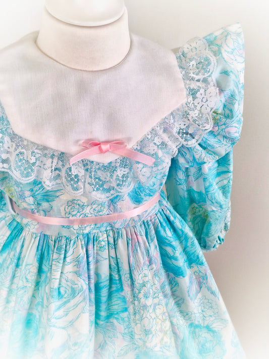 4-5 years. Cottagecore vintage dress with blues, pink and white details, long sleeves and flutter shoulders