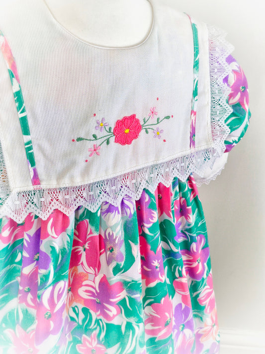 5-6 years. Vibrant floral vintage dress with white bib and flower embroidery