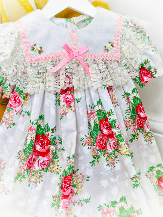 4 years. Vintage Jinelle dress with vibrant floral print, white lace bib collar and pink waist tie and lace hem
