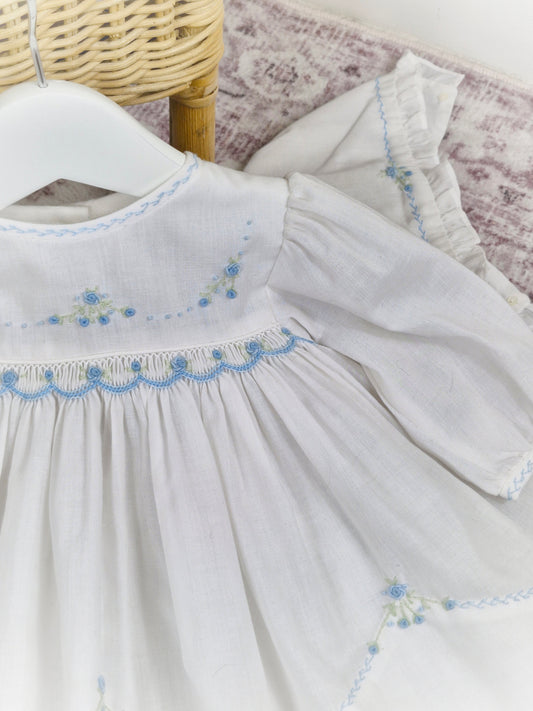 9 months. Sarah Louise dress and bonnet set, white with blue smocking and embroidered flowers