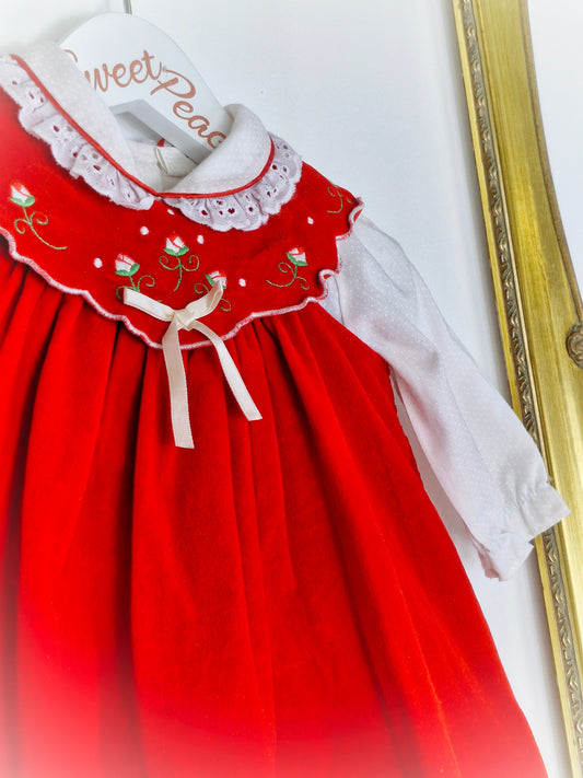 6-9 months. Two-piece set. Red corduroy dungarees with smocking and embroidered Christmas trees. Includes white collared shirt.