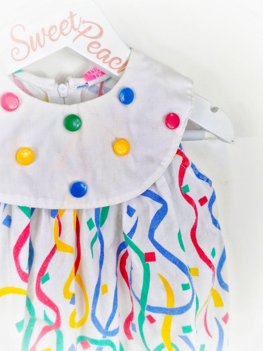 9 months. Polly Flinders romper with primary coloured buttons and print