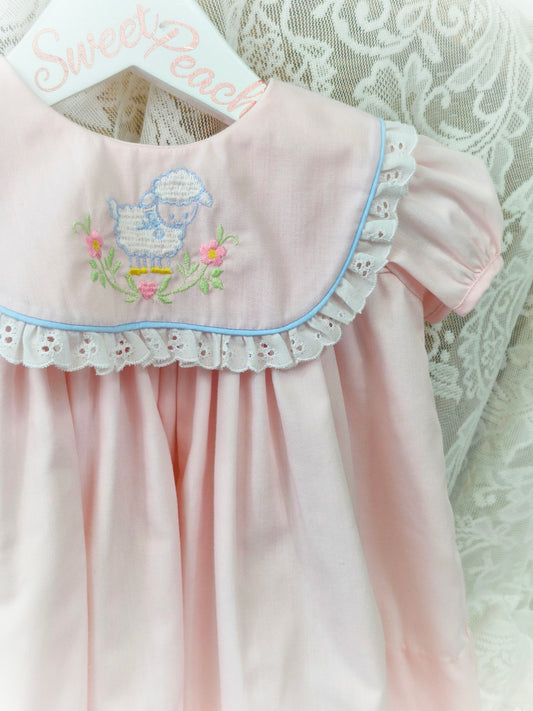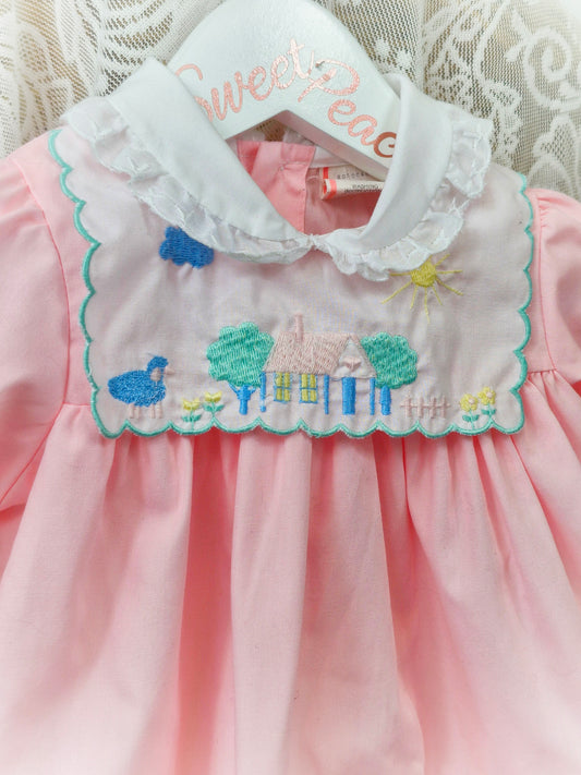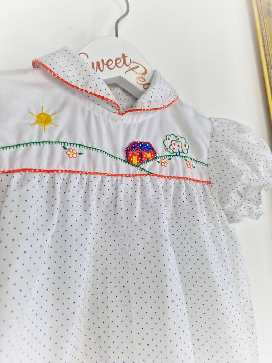 9-12 months. Blue and white dress with collar and embroidered flowers