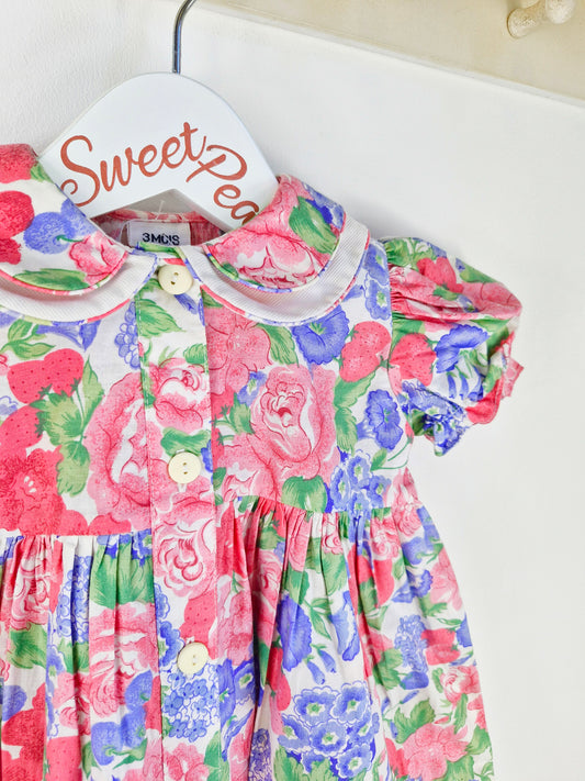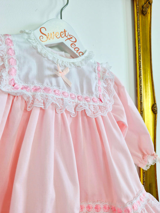 9-12 months. Pink Alexis dress with white bib, lace and ribbon details