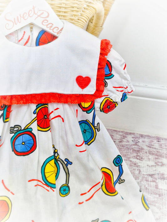 12-18 months. White handmade dress with red hearts and lace on bib and bicycle print