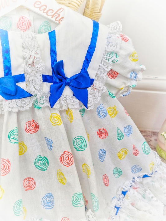 12-18 months. White Kotton Kandi dress with royal blue ribbon, lace and primary coloured prints