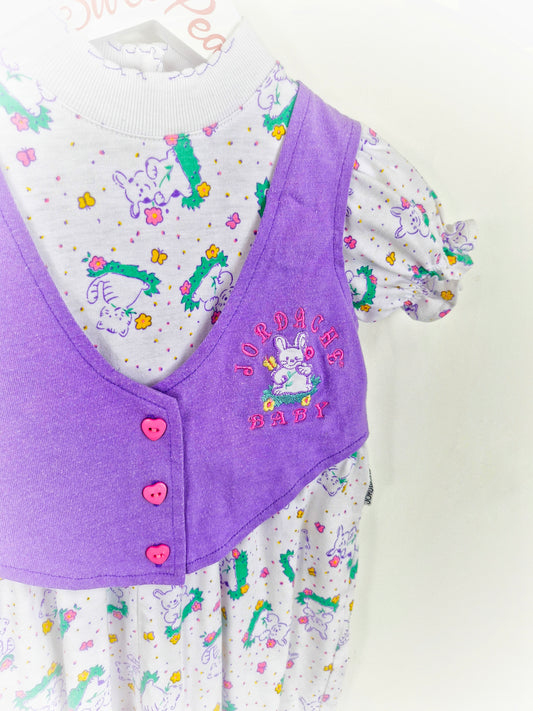 18 months. Purple and white romper with rabbit prints and heart buttons