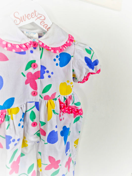 18 months. White romper with bright flowers and butterflies and polka dot trim. From Cuties by Judy
