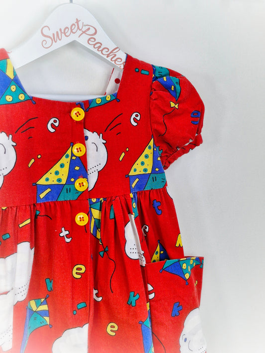 12-18 months. Bright, floral Roanna dress with lace bib and pink ribbon