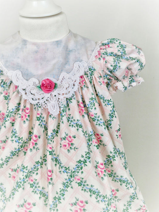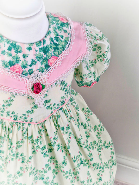 3 years. Vintage Carters dress, cream with green vine leaves, pink roses and double bib